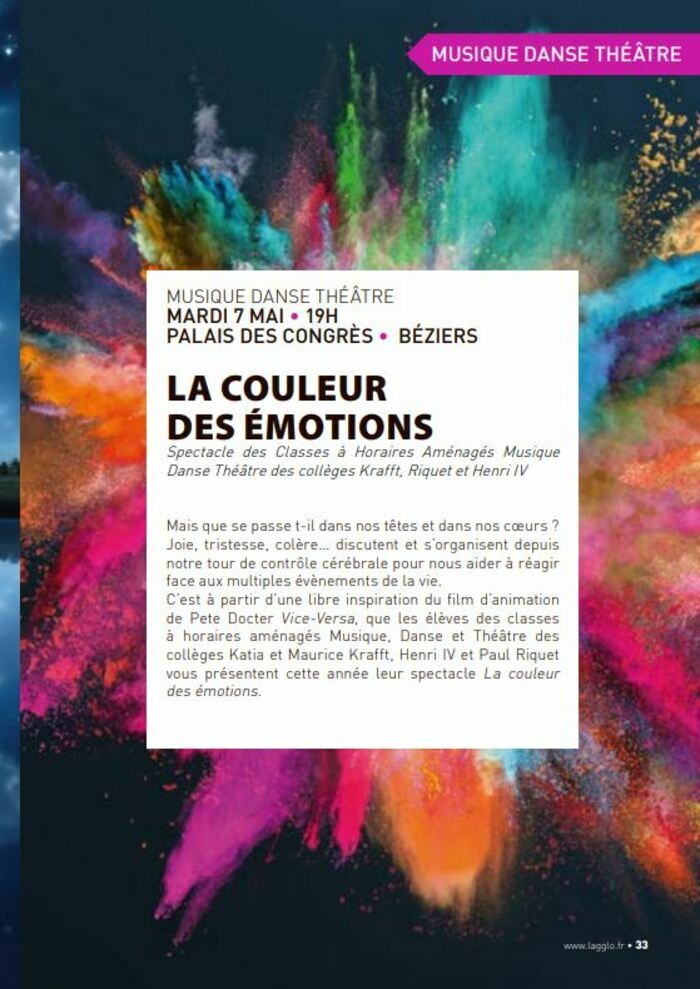 C'est à partir d'une libre expression du film d'animation de Peter DOCTOR, Vice-Versa que les élèves des classes à horaires aménagés Musique, Danse et Théâtre des Collèges Katia et Maurice Krafft, Henri 4 et Paul Riquet vous présentent cette année le spectacle La couleur des émotions